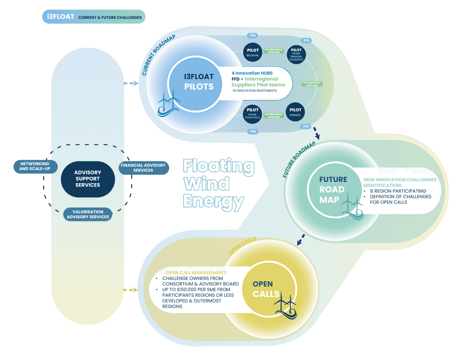 I3FLOAT se enfocará en el desarrollo de inversiones interregionales en innovación en cuatro proyectos piloto I3 en las regiones participantes diseñados para afrontar los desafíos actuales del sector. Dichas iniciativas abordarán cuestiones como la creación de diseños más avanzados, el uso de materiales más innovadores, la mejora de los procedimientos de fabricación y de la cadena de suministro, las actividades posteriores a la creación de prototipos y la modelización empresarial, la logística e instalación y la conectividad y el mantenimiento.